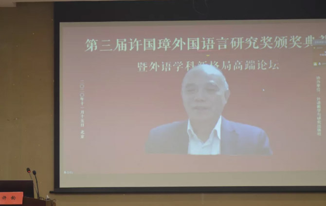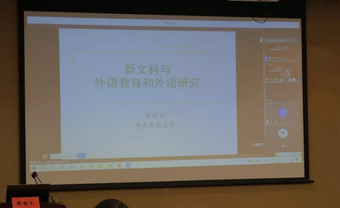 院长黄国文教授以《新文科与外语教育和外语研究》为主题作了主旨报告。他以新时代教育的根本问题为切入点,指出新时代教育的共同点、外语学科与其他学科的关系、新文科视域下的外语教育和外语研究问题,并强调各高校必须凝练外语学科的特色,要依靠母体学校的特色和发展规划。黄国文教授解读了新文科之“新”,就新文科背景下外语教育和外语研究指明了方向,要依靠母体学校的特色和发展规划,外语专业在母体学校找到自己的定位。外语学科要在本校找到自己的位置,发挥自己的作用,才会有一席之地,这跟许钧教授的观点遥相呼应。