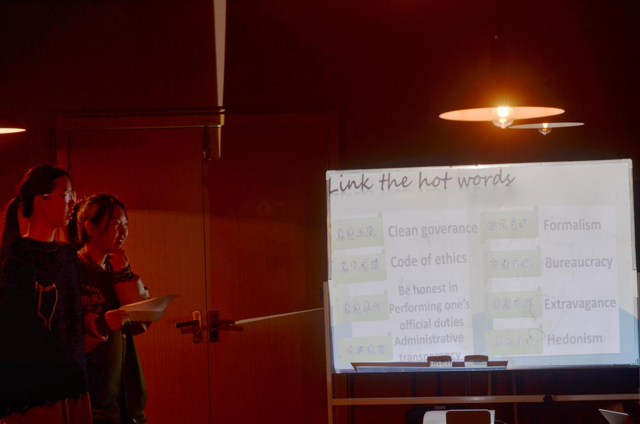 活动中,同学们以“廉洁文化”为主题展开了激烈的讨论,对腐败的现象和结果进行了探讨,学习了有关廉洁建设的热点词语,以英译剧情形式还原了热点事件,明白了作为当代青年大学生,应积极践行“八荣八耻”,时刻牢记“廉洁”教育,养成“廉洁”意识,进而为日后步入社会奠定良好的基础。