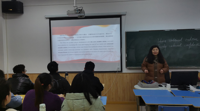 大学英语部全体教师积极开展以课程思政为主题的教研活动,深入学习全会精神,以课程“思政周语”为引领,通过“党的十九届六中全会精神”专题系列,结合大学英语课程特色,在大学英语课堂进行导学、导思。在国际交流英语课堂中,通过对中西文化的阐述与对比,引导学生不断增强政治判断力、领悟力,从统筹疫情常态化管理看党中央权威和集中领导的重大作用,坚决维护党的领导,建立大局意识,树立制度自信和文化自信。